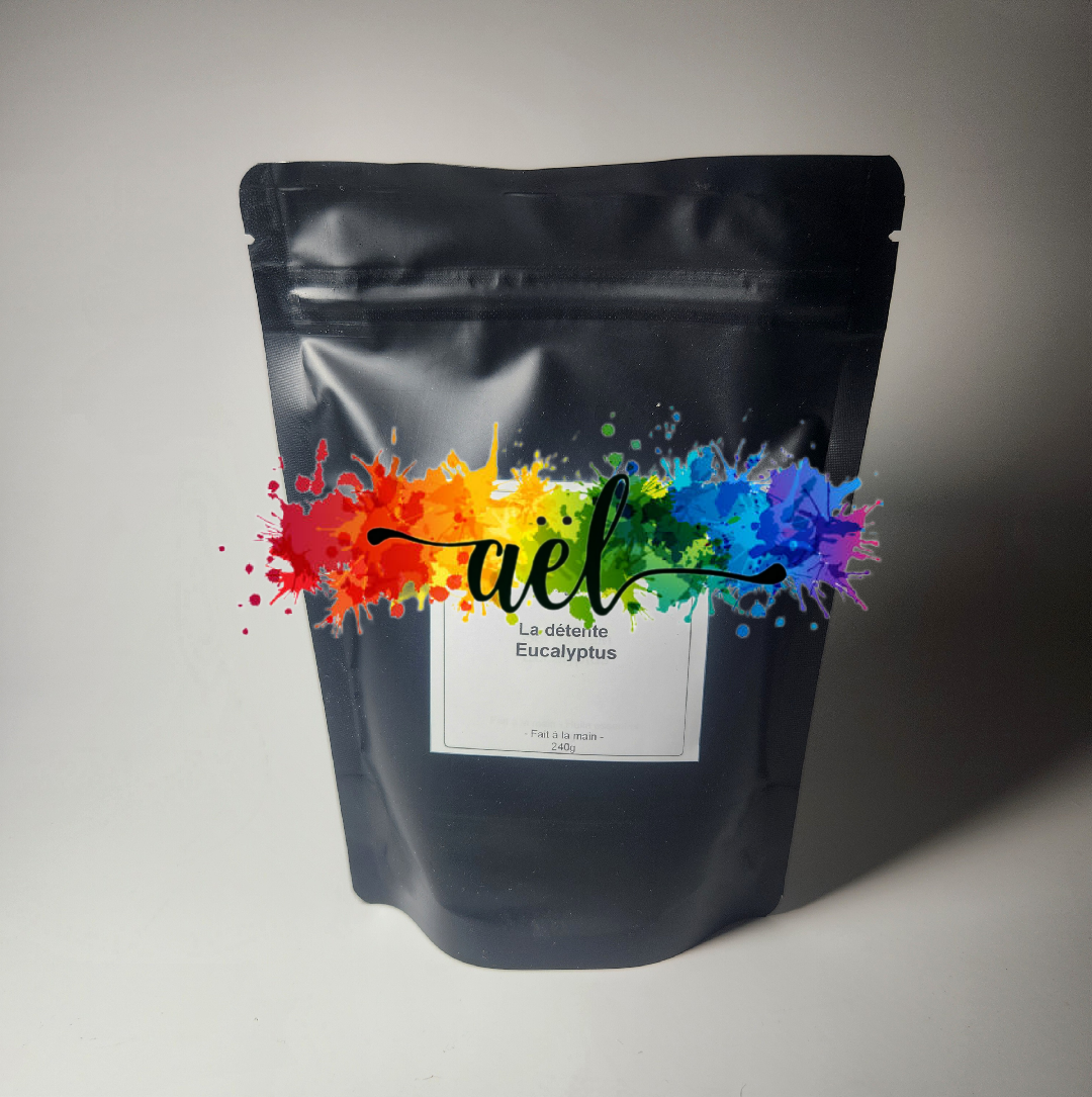 Lune bleu : Sulfate de magnésium, bicarbonnate de soude, huile d'olive, HE eucalyptus, Pétale de fleur de bleuet et feuille d'eucalyptus.
